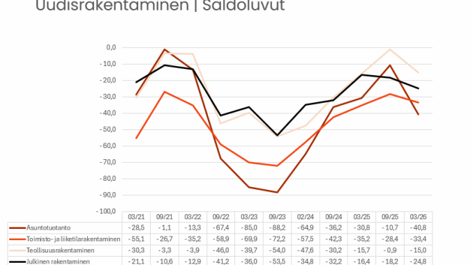 Uudisrakentamisen näkymät ovat heikentyneet selvästi syksystä kaikilla uudistuotannon osa-alueilla. Erityisesti asuntorakentamisessa muutos on ollut voimakas, ja keväällä alkanut varovainen positiivinen kehitys on kääntynyt uudelleen laskuun (saldoluku syksyllä -10,7 ja keväällä -40,8). Teollisuusrakentamisen saldoluku on muita osa-alueita parempi, mutta sekin on edelleen selvästi negatiivinen (-15).